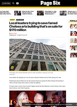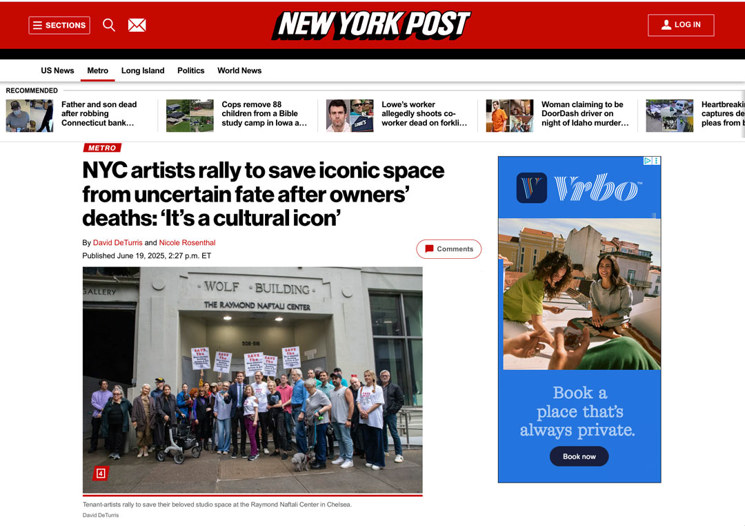 The artist tenants, united through the West Chelsea Building Artists Association (WCBAA), are calling on the estate and potential buyers to preserve the building’s use as an affordable artist studio space, in accordance with the legacy of arts patron Raymond and Gloria Naftali, who were instrumental in supporting the building’s artistic mission.